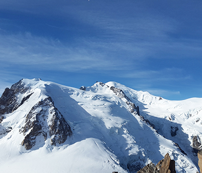 阿爾卑斯山的最高峰,海拔為4,808.73公尺,位於法國的上薩瓦省和義大利的瓦萊達奧斯塔的交界處。白朗峰意為「白色山峰」,峰頂永遠覆蓋著厚實的冰雪,厚度並不一致。ㄧ直歐洲登山愛好者想要征服的ㄧ座高山,而且還是歐洲最高峰,但因山上氣候詭譎多變,想要成功登頂不容易,ㄧ直到1786年才被征服。